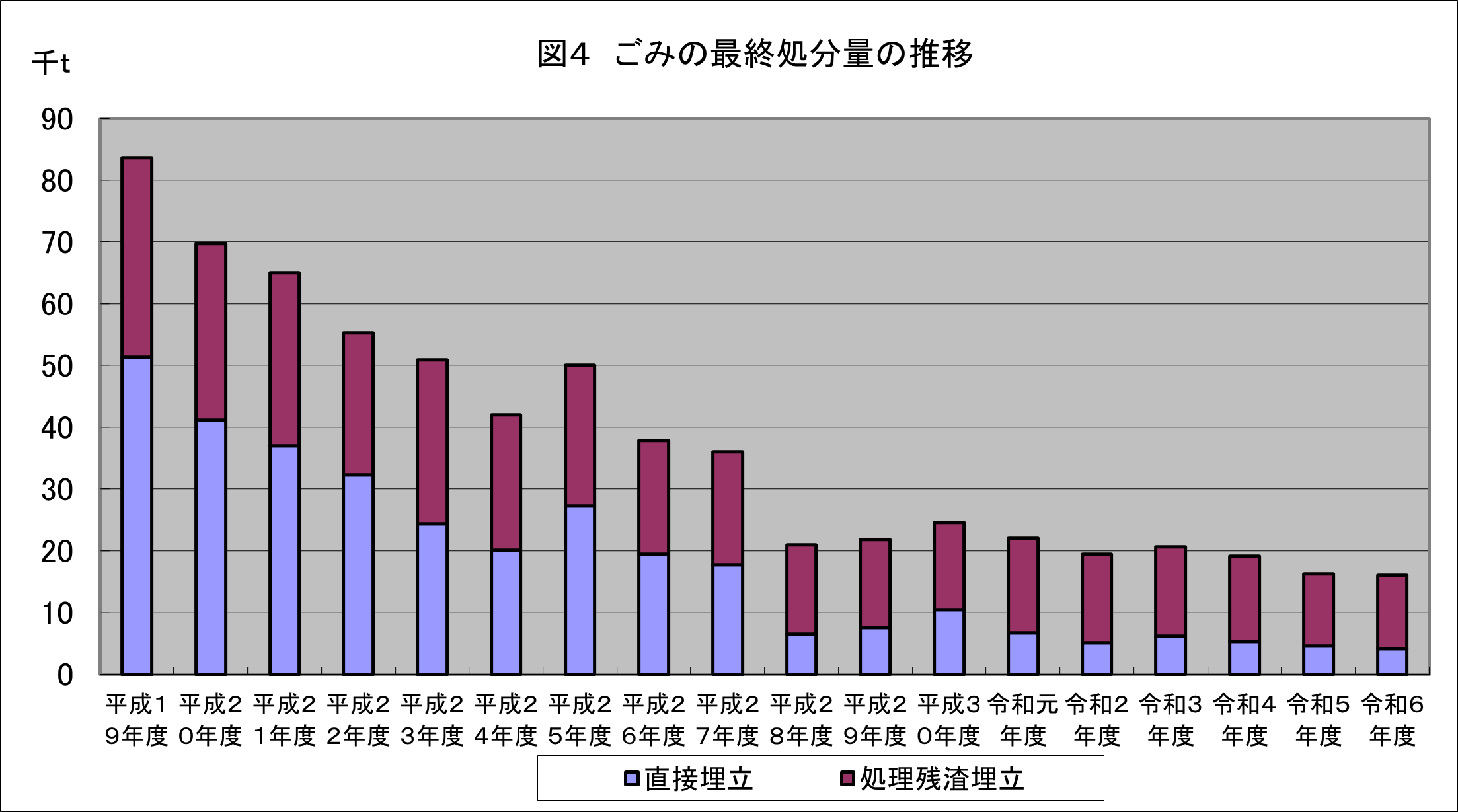 ごみの最終処分量は、焼却灰の資源化の推進や容器包装リサイクル法による容器包装廃棄物の分別収集などにより資源化量が増加したため、年々減少傾向にあり、令和6年度は16千t となっています。16千t のうち直接埋立量が4千t(26%)で、焼却等中間処理残さの埋立量が12千t(74%)となっています。