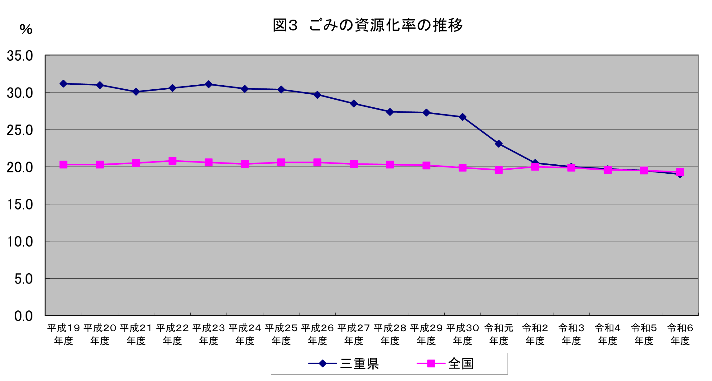 ごみの資源化率は、ごみのRDF化を行う市町の減少等のため、近年は減少傾向となっています。令和6年度の資源化率は19.0%となっています。