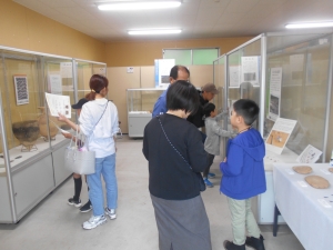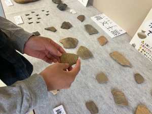 縄文時代の土器や石器、弥生時代の土器、古墳時代の土器など県内の遺跡からみつかった資料を触ることのできるコーナーです。みなさん、本物を手にとって重さや硬さなどを比べて楽しんでいました。