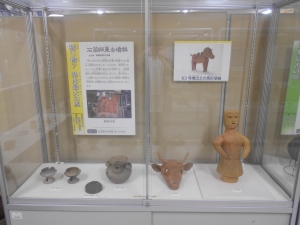 三重県を代表する遺跡を紹介するパネル展示です。今回は当センターのホームページ「みえの遺跡紹介」で紹介した遺跡の出土遺物や、過去の展覧会で紹介した遺跡の遺物を展示しました。津城跡の安東焼や石薬師東古墳群の鹿形埴輪など、さまざまな遺物や遺跡の様子を多くの方にごらんいただきました。