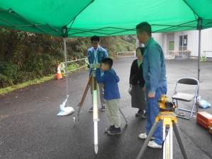 発掘調査には欠かせない、地面の高さの違いを測定する機器、「レベル」の操作を体験してもらうコーナーです。測定したい場所に機器を向け、ピントを合わせて測定するには、コツが必要です。スタッフの説明を聞きながら、うまく合わせることができていました。