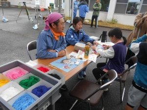 今回初めて実施した、段ボール紙を使った簡単な機織り機を使って、本のしおりのような布を作る体験コーナーです。縦糸と緯糸をうまく組み合わせながら編みあげていくのは根気がいりますが、編み目をしっかりつめたり、色をカラフルにしてみたり、思い思いの布を完成させていました。