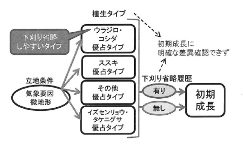 新植地におけるヒノキの初期成長は雑草木による被圧、品種などのほか、地形や傾斜、気象などの立地条件に影響されます。また、新植地に侵入して植栽木と競合する競合植生についても立地条件に影響を受けて様々なタイプが発達します。つまり、立地条件の違いによりヒノキの成長、雑草木の植生タイプが異なり、それらの相互作用も異なることから、事前に立地条件をみて、どのような植生が出現するかを予測すること、あるいは新植地に成立した植生をみることで、下刈りの省略可否を事前に判断できる可能性があります(図1)。