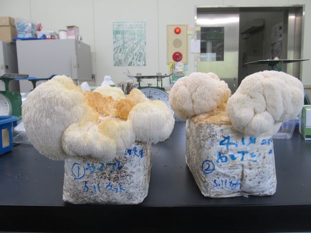 ヤマブシタケはサンゴハリタケ科サンゴハリタケ属のきのこで、晩夏から秋にかけて広葉樹に発生します。ヤマブシタケは機能性成分を多く含んでおり、特に認知症等ヘの効果が期待されるヘリセノン類を含有していることから、注目されているきのこです。 現在、ブラウン系エノキタケと同様に培養期間や培養温度、発生温度について調査を行っており、安定生産技術の開発に取り組んでいます。