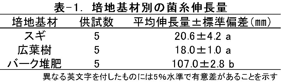 結果は表―1のとおりで、バーク堆肥での伸長量が著しく大きく、ササクレヒトヨタケの菌床栽培にはバーク堆肥を培地基材として用いることが有効であることが分かりました。