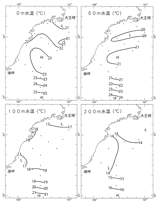 調査時の水温は、表面は20.1~25.3℃、50mでは19.9~24.1℃、100mでは16.6~21.4℃、200mでは13.1~16.6℃の範囲にあった。水温は、南部沖合域(測点29,30)を除き、表面では平年より1℃前後低めから1℃前後高め、50mではごく沿岸で平年並のほかは平年より2~3.5℃前後高め、100m及び200mでは平年より1.5~3℃前後高めであった。測点1,8の50m、測点8の100mで同月の過去最高水温を更新した。一方、南部沖合域の水温は、測点29は表面及び50mでは平年より1℃前後高め、100m及び200mでは平年並、測点30は表面、50m及び100mでは平年より1~2℃前後高め、200mでは平年並であった。