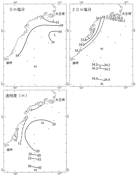 塩分は、表面は32.32~34.64、20mでは33.60~34.45、200mでは34.46~34.59の範囲にあり、表面及び20mでは平年より低い測点が多く、200mでは概ね平年並であった。