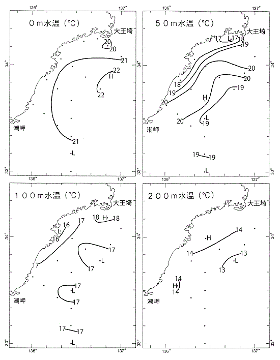 調査時の水温は、表面は19.8~22.1℃、50mでは16.7~20.8℃、100mでは15.8~18.5℃、200mでは12.8~14.9℃の範囲にあった。水温は、熊野灘南部沖合(測点29,30)を除き、表面では1~2.5℃前後高め、50m、100m及び200mでは、ごく沿岸の50mで平年並であったほかは平年より1.5~3.5℃前後高めであった。測点17の50m及び測点22の100mで同月の過去最高水温を更新した。一方、南部沖合では、表面、50m、100m及び200mで平年より低め~かなり低めであった。