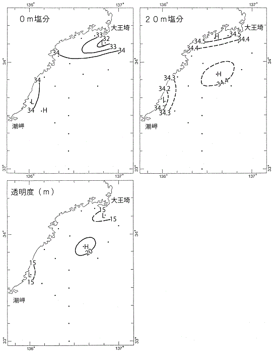 塩分は、表面は31.18~34.41、20mでは34.14~34.54、200mでは34.44~34.54で、表面及び20mでは平年より低い測点が多く、200mでは概ね平年並であった。