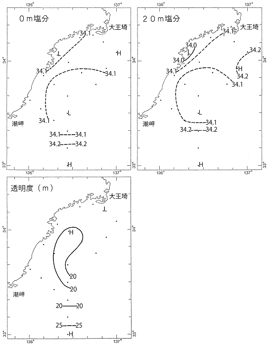 塩分は、表面は34.03~34.28、20mでは33.97~34.29、200mでは34.35~34.61の範囲にあり、表面では平年並、20m及び200mでは平年より値が低い測点が多かった。