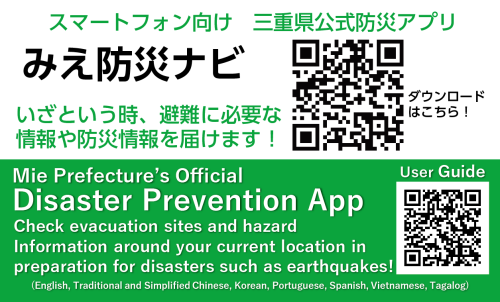 県では、今後予想される、南海トラフ地震などの災害発生に備え、県民の皆さんや県内に旅行に来られる方の避難を支援するための各種防災情報を提供する三重県公式防災アプリ「みえ防災ナビ」を運用しています。