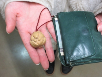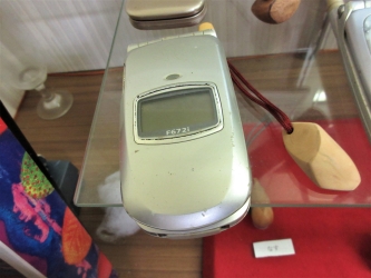 現在、根付には、財布や携帯電話に下げるストラップなどの実用的な美術品として現代的な用途が見出されています。「伊勢根付彫刻館」でも、根付の使用例として、忠峰さんが生前に使っていた携帯電話に根付を付けて展示しています。