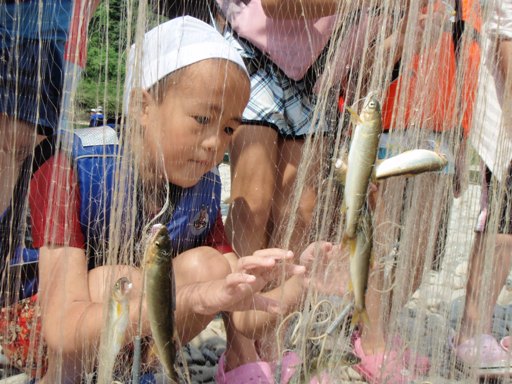 | ▲お茶畑などでの作業の後は、美しい川で釣りや川遊びをしたり、鮎のシャクリ漁や追い込み漁を楽しみました。ある時は、地元の方の畑で、トウモロコシやピーマン、スイカ、ナスなどの収穫体験を行いました。地元の方のご指導のもと、ネームプレートやストラップなどの木製クラフト作りをした時もあ・閧ワした。 |