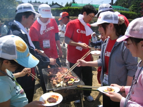 | ▲作業や体験の後は、地元の鹿肉、猪肉を使ったバーベキューを行い、地元の方や七保小の子供たちと親睦を深めました。収穫した野菜を食べたこともありました。 |