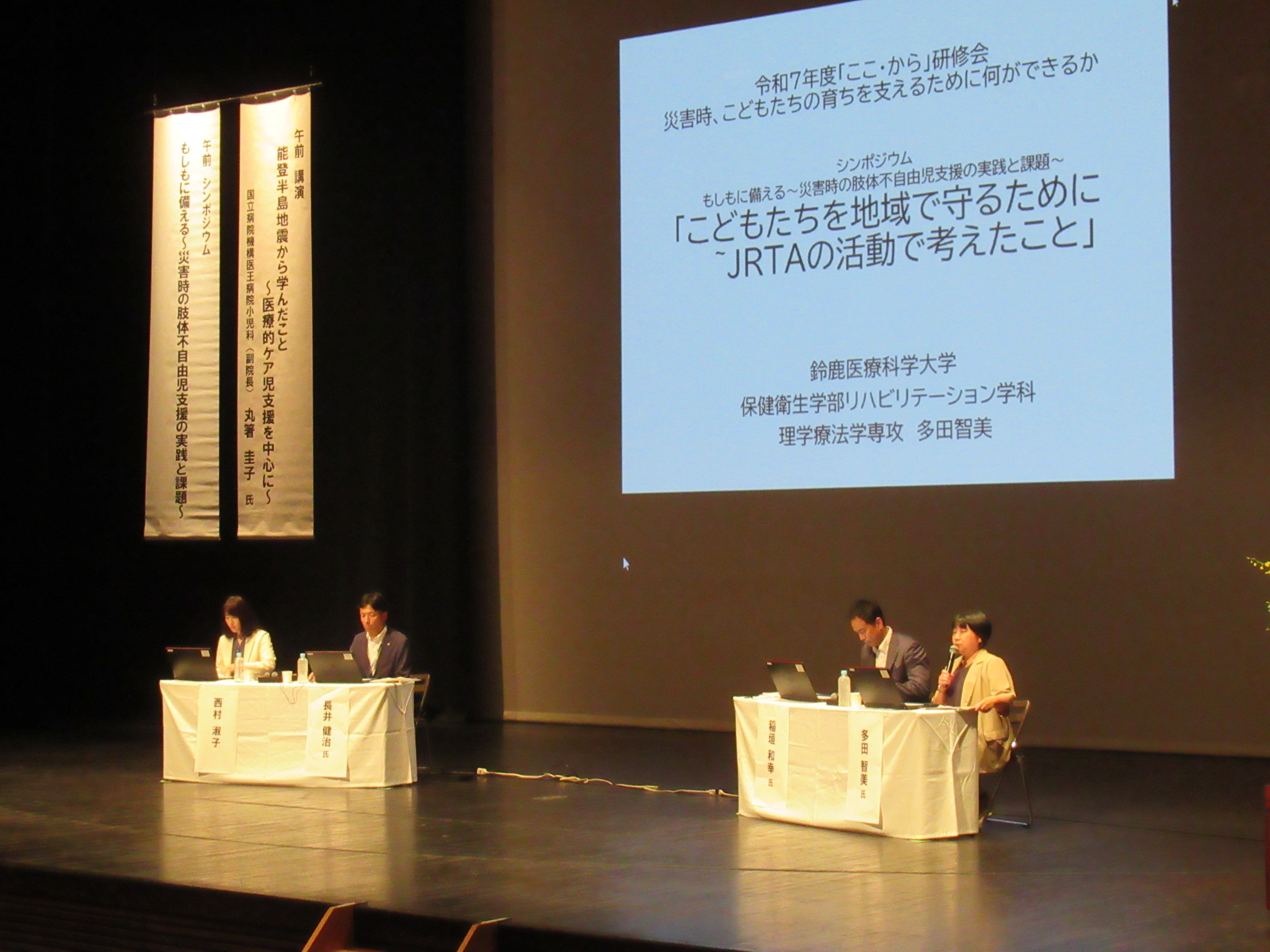 その後、「もしもに備える~災害時の肢体不自由児支援の実践と課題~」と題し、シンポジウムを行いました。まず、鈴鹿医療科学大学保健衛生学部リハビリテーション学科理学療法学専攻助教多田智美氏にJRAT(※)活動の一環として能登半島地震にて支援をされたご経験から日頃から顔の見える関係を築いておくこと、必要な支援や行動を予め考えておくことの重要性をお話しいただき、名張市なばりの未来創造部危機管理室稲垣和幸氏に、市において個別避難計画を作成されたご経験から、個別避難計画を立てること自体が連携の強化につながること、災害時には行政だけでなく地域社会全体の協力が不可欠であることなどをお話しいただきました。これに対し、三重県防災対策部地域防災推進課長長井健治氏から避難行動要支援者に対する個別支援計画の作成があまり進んでいないという課題が示されました。