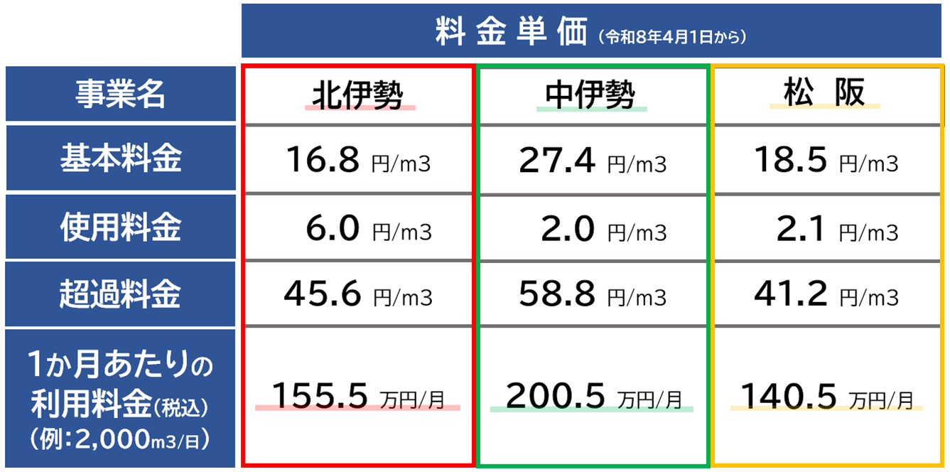 三重県では、平成2年度から北伊勢、中伊勢、松阪工業用水道事業で二部料金制を採用しています。二部料金制とは基本料金と使用料金からなる制度で、使用者の節水や工業用水の回収利用等の努力が料金に反映できる制度です。