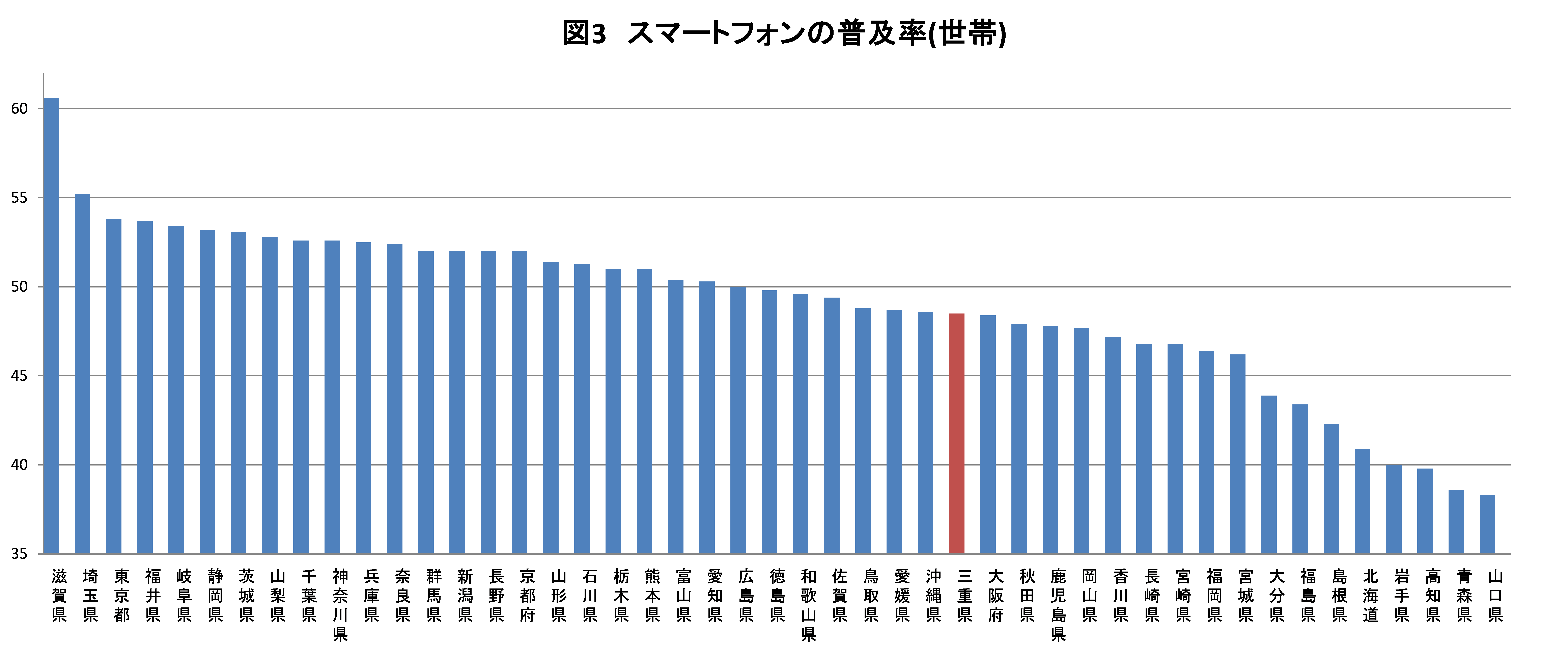 総務省統計局の平成26年全国消費実態調査によれば、スマートフォン単独の世帯普及率は、全国が50.2%、三重県が48.5%となりました。
