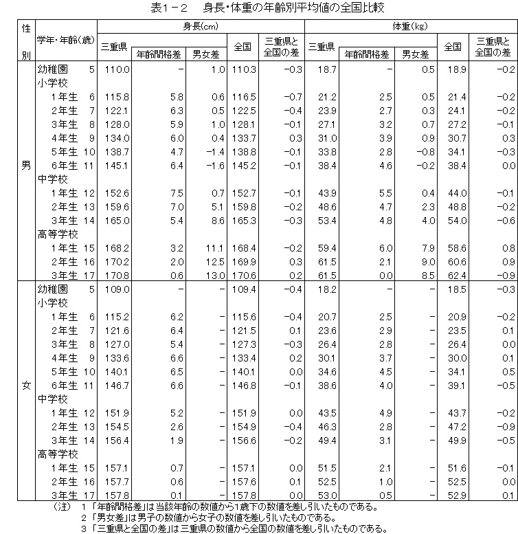 1 身長・体重の平均値及び全国平均との比較
