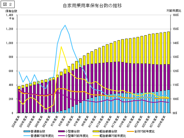 平成になった頃からの数年間で大きく増加していますが、その内訳をみると、普通乗用車が平成3年度の対前年度比152.8%をピークに平成元年度から平成5年度にかけて対前年度比130%以上の伸び率を示しています。