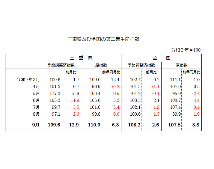 令和7年9月の三重県鉱工業の動き(令和7年11月21日発表)