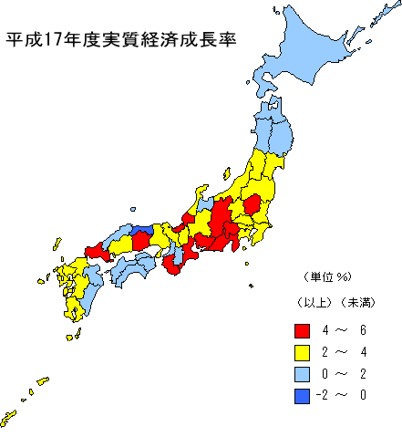 また、都道府県別の実質経済成長率の状況は次の地図グラフのとおりですが、これによると中部地方から関東地方にかけての県が高くなっていることが判ります。