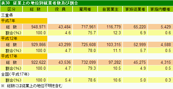 就業者922,622人を従業上の地位別にみると、役員が43,536人、雇用者が732,099人、自営業主が97,282人、家族従業者が45,275人、家庭内職者が4,315人となっていて、就業者に占める割合は、雇用者が79.3%と最も高くなっています。平成7年からの推移をみると、役員、雇用者は増加、自営業主、家族従業者及び家庭内職者は減少の傾向が続いています。 全国と比較すると、雇用者と家庭内職者の地位で割合が上回っています。 <表30> |