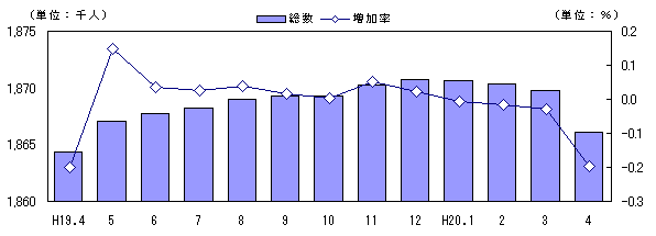 推計人口および推計世帯数は、平成17年国勢調査 第1次基本集計結果 市区町村別人口を基礎として、各市町から報告された住民基本台帳および外国人登録における動態結果を加減し算出しました。