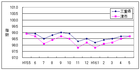 平成16年5月の三重県消費者物価指数(津・桑名・上野・尾鷲の4市平均)は、総合指数で98.7(平成12年=100)となり、対前月比は前月と同水準、対前年同月比は0.2%の下落でした。