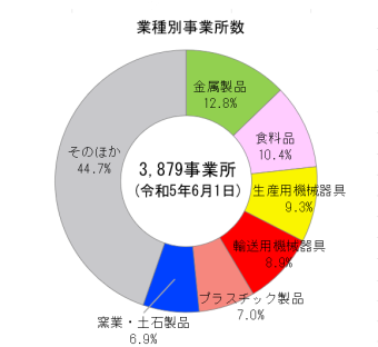 「金属製品(きんぞくせいひん)製造業」、「食料品(しょくりょうひん)製造業」、「化学工業(かがくこうぎょう)」などのつくるものによってわけられた仕事(しごと)の種類(しゅるい)です。