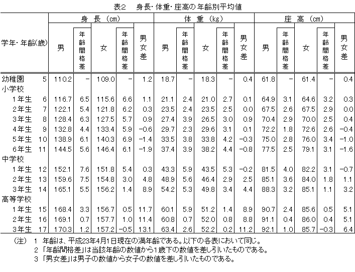平成23年度の結果を30年前(親世代)の昭和56年度と比べると、身長では男子はすべての年齢を上回っており、女子では14歳で親世代と同じ、それ以外の年齢では親世代を上回っています。体重では、男子5歳、女子15歳、17歳で親世代を下回っており、それ以外の年齢では親世代を上回っています。座高では、男子5歳、女子5歳で親世代を下回っており、男子6歳は親世代と同じ、それ以外の年齢では親世代を上回っています。