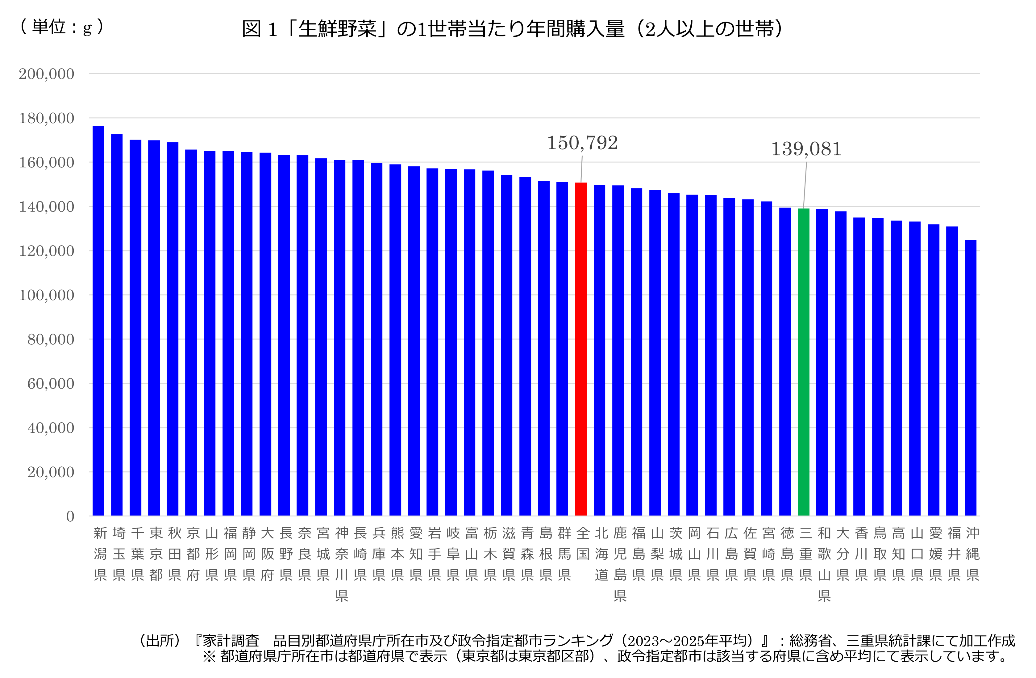 図1は、家計調査・品目別ランキング(令和5~7年平均)における「生鮮野菜」の年間購入量を都道府県別に表示し、多い順に並べたグラフになります。