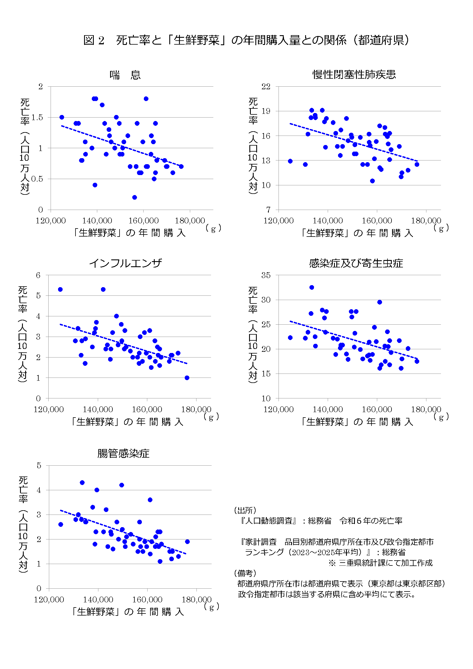 図2は、令和6年における主な呼吸器系疾患(喘息、慢性閉塞性肺疾患、インフルエンザ)及び感染症関連の疾患(感染症及び寄生虫症、腸管感染症)が死因の死亡率(人口10万人対)と「生鮮野菜」の年間購入量との関係を都道府県別に散布図で表したものです。