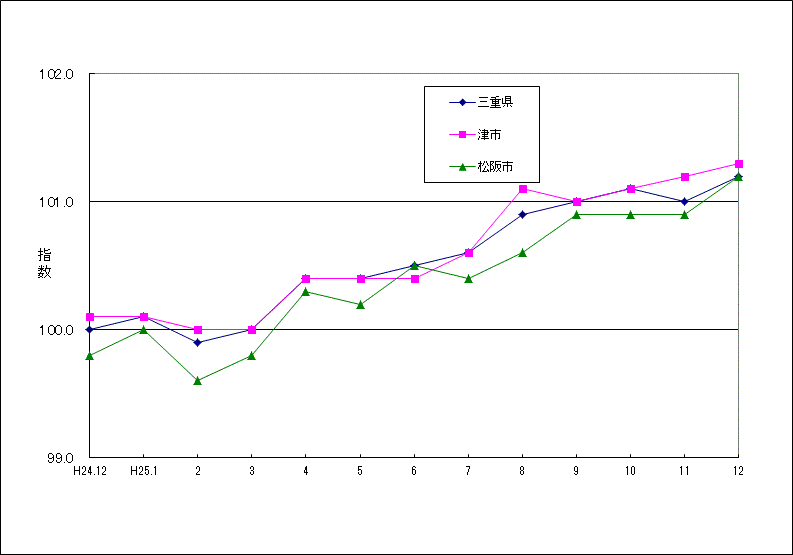 平成25年12月の三重県消費者物価指数(津・松阪・桑名・伊賀・尾鷲の5市平均)は、総合指数で101.2(平成22年=100)となり前月より0.2%の上昇、対前年同月比は1.3%の上昇でした。