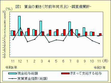 1 賃金の動き(事業所規模5人以上)「きまって支給する給与」は、対前年同月比0.9%増の275,877円「きまって支給する給与」は275,877円で対前年同月比0.9%増、賞与など「特別に支払われた給与」を合わせた「現金給与総額」は293,459円で対前年同月比0.2%減でした。また、「実質賃金指数(総額)」は82.9で対前年同月比3.3%減でした。