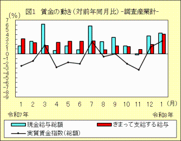 1 賃金の動き(事業所規模5人以上)「きまって支給する給与」は、対前年同月比4.1%増の277,688円「きまって支給する給与」は277,688円で対前年同月比4.1%増、賞与など「特別に支払われた給与」を合わせた「現金給与総額」は283,734円で対前年同月比4.3%増でした。また、「実質賃金指数(総額)」は80.7で対前年同月比2.7%増でした。