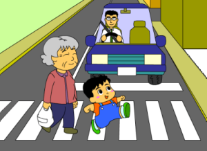 横断歩道付近では、すぐに止まれるように減速をしましょう。