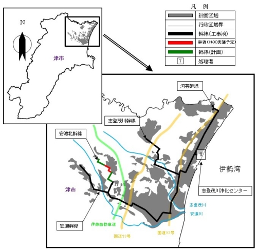 | 下水処理方式 | 全体計画 凝集剤添加硝化脱窒法+急速ろ過法 |