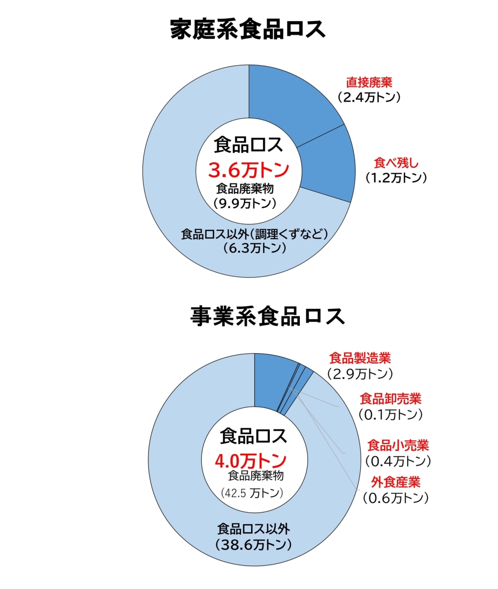 日本の食品ロスの量は約464万トンと推計されています。そのうち事業系食品ロスは約231万トン、家庭系食品ロス約233万トンです。(令和5年度、農林水産省・環境省)