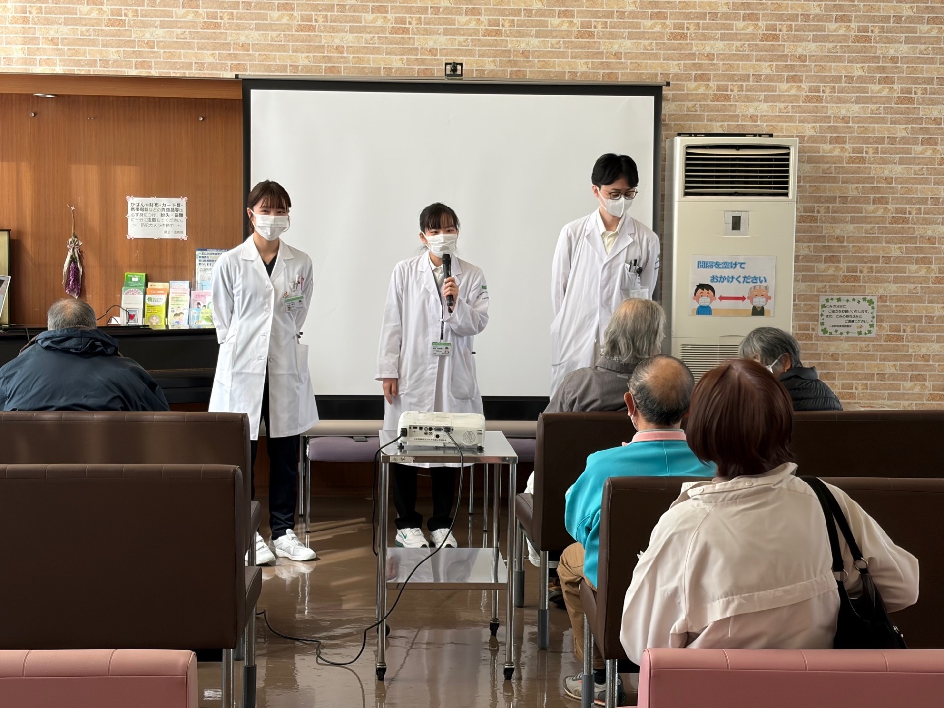 3月6日(金)、糖尿病教室を開催しました。冒頭ではアイスブレイクとして実習中の医学生による自己紹介やクイズを行い、参加された皆さまと楽しく交流しました。その後当院の中根慶太医師(糖尿病専門医)から「糖尿病を理解しましょう!」をテーマに、イラストを交えて説明しました。糖尿病は血液中のブドウ糖が増えすぎる(血糖が上がる)病気で、血糖を下げるホルモンであるインスリンが十分に作用しないために発症します。 また、血糖が高い状態が続くことで合併症も発症してしまいます。治療法としては、大きく分けて「運動」「食事」「薬」の3つがあり、自身で実践できることや糖尿病と向き合う心得について紹介しました。当院では、今後も健康教室等による住民啓発に取り組んでまいります。