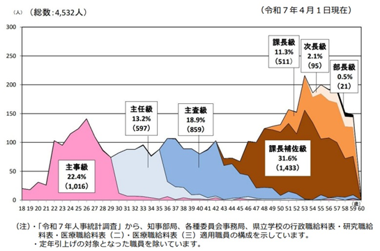- 60歳を超える職員が培ってきた知識と経験を生かせるよう、適材適所の人事配置を行うとともに、いきいきと働くことができる職場環境づくりを推進していくことが必要