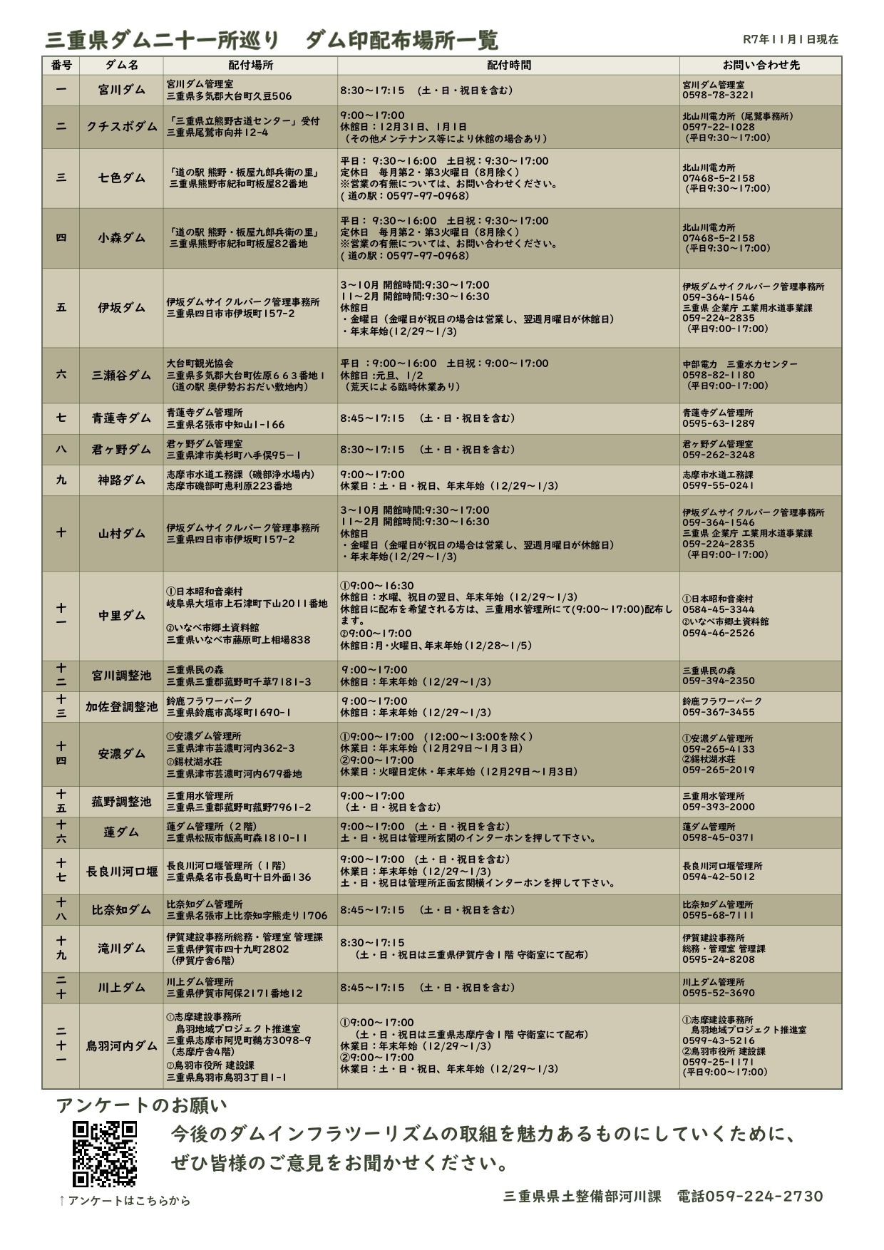 令和7年11月1日から、三重県内にある様々なダムの役割を知っていただくことや、地域の観光振興を目的として、「ダム印」を配布する「三重県ダム二十一所巡り」を開催します。詳細は詳細情報HPをご確認ください。1. 開催期間