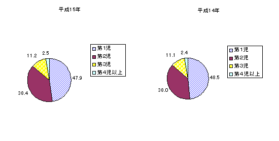出生児16,497人の出生順位の割合は、第1児が7,904人で全体の47.9%、第2児が6,341人で38.4%、第3児が1,844人で11.2%となっており、前年と比べ第2児、3児及び4児以上の割合が増加し、第1児の割合が減少した。