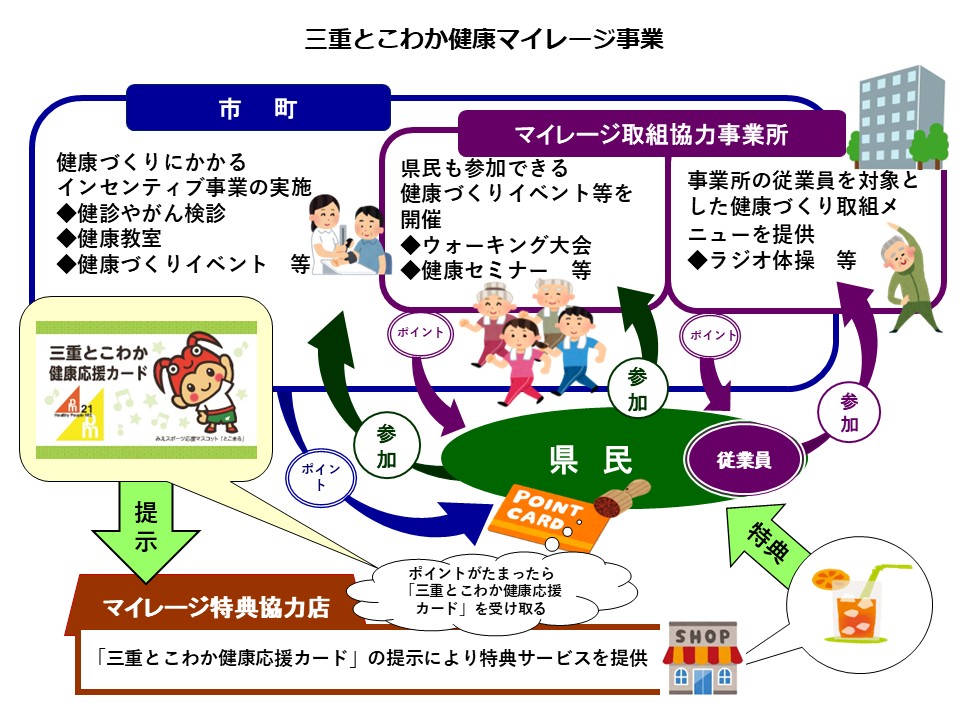 県民の皆さんが、食生活や運動などの生活習慣改善の実施、健康診査の受診、地域活動への参加、「マイレージ取組協力事業所」の提供する健康づくり取組メニューなど、マイレージ事業を実施する市町の健康づくりメニューへ参加することにより、ポイントを獲得します。一定のポイントを獲得した県民の皆さんには、市町より「三重とこわか健康応援カード」が交付されます。