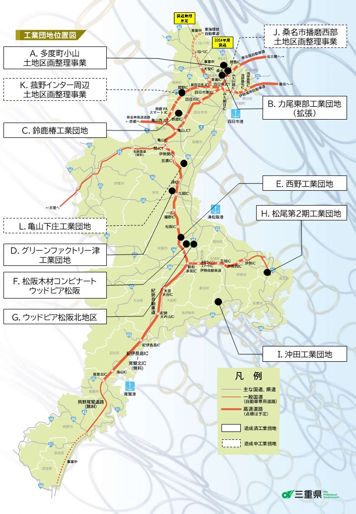 | C.鈴鹿椿工業団地 | 鈴鹿PAスマートIC周辺土地区画整理組合 | 鈴鹿市山本町地内 | 約9.9ha (残2区画) |