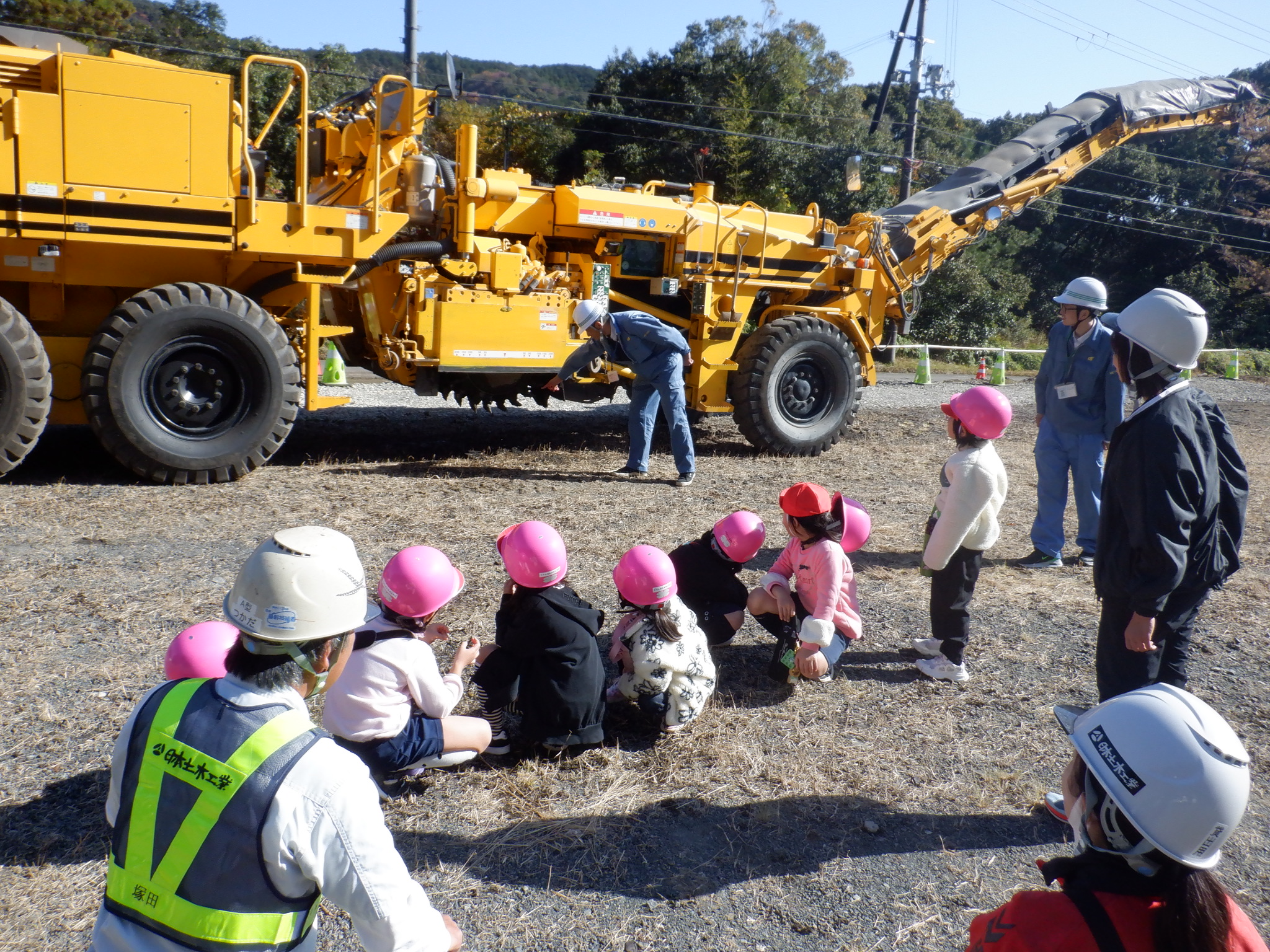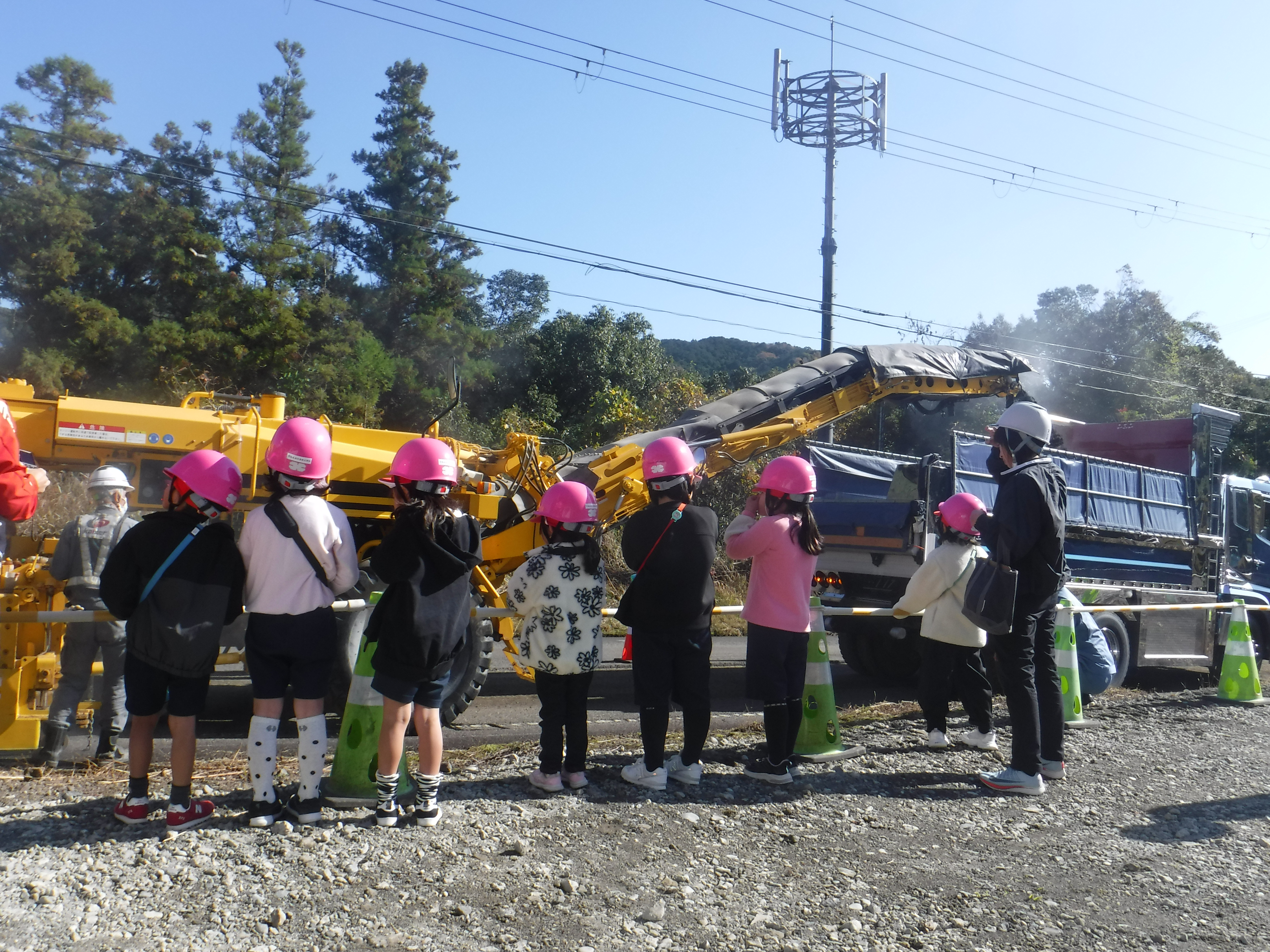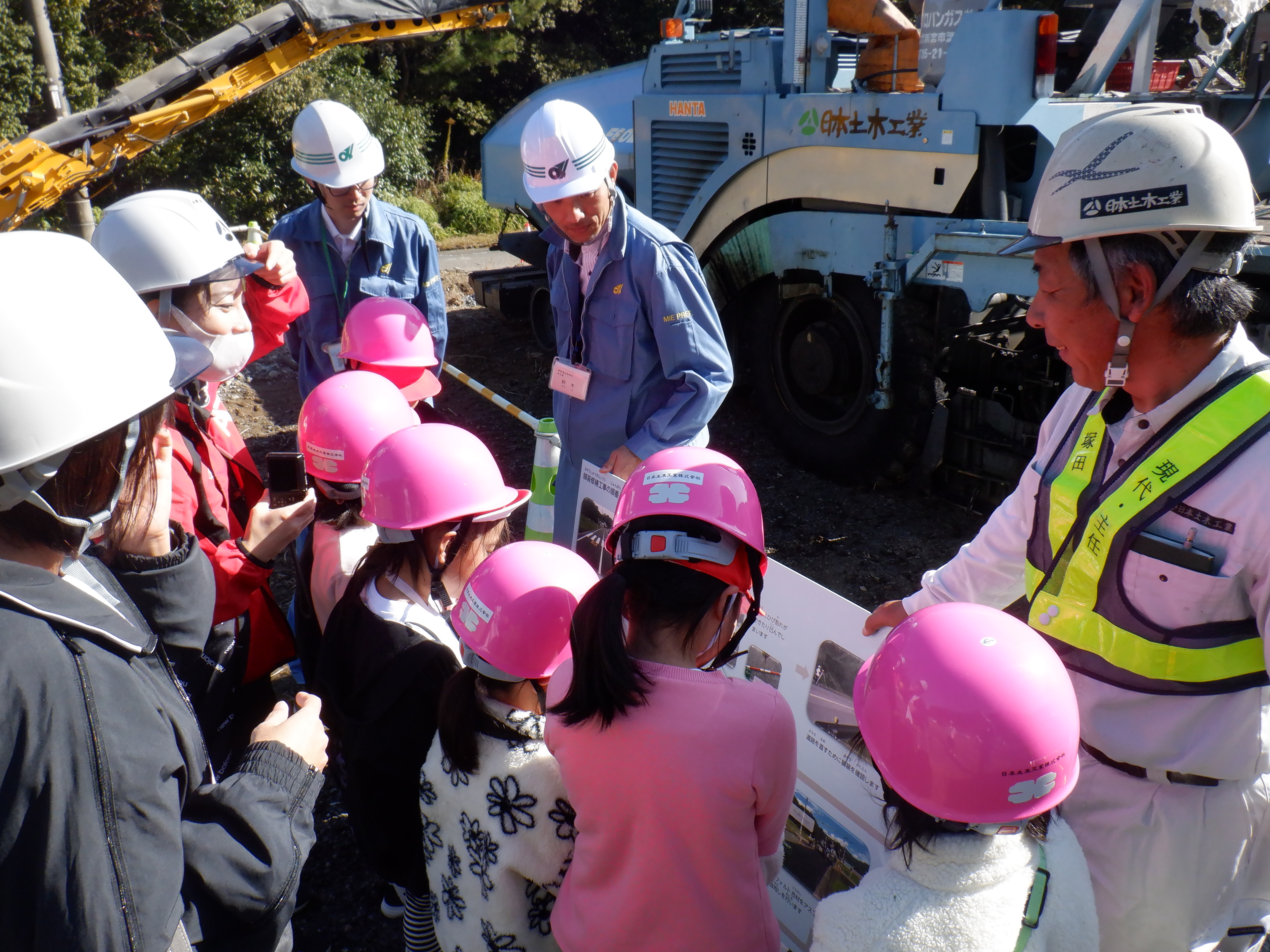 舗装修繕工事を見学することで、公共工事や工事施工を担う建設業の役割について理解を深めていただきました。