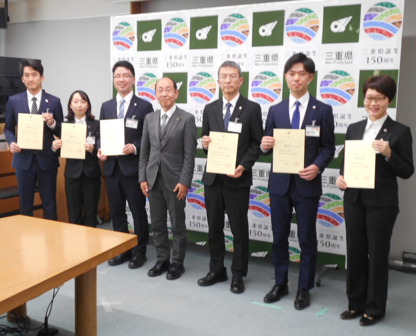 (向かって左から)みえ国際協力大使 秋山 真之介さん、武石 椰々さん、武内 哲さん、三重県副知事 後田 和也、みえ国際協力大使 山田 悟さん、窪 順平さん、大西 郁子さん