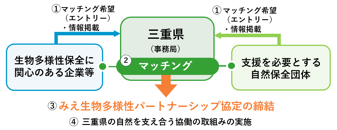 そのため、県が中心となって、生物多様性保全活動団体と企業等とのマッチングを進め、その活動を強化する仕組みとして、社会全体で三重県の自然を支え合うことを目的とする「みえ生物多様性パートナーシップ協定」の取組を進めています。