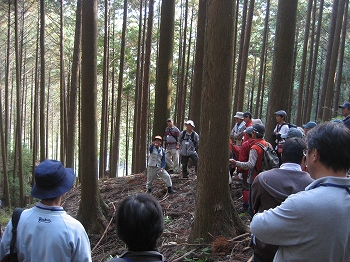 セミナーでは、上尾氏が所有する見事な「美林」を見学させていただくとともに、興味深い林業の道具類をたくさん見せていただきました。途中、上尾欽吾氏の息子さんの智洋(ともひろ)氏や先代の弘(ひろむ)氏の飛び入りでのご協力もいただき、参加者のみなさんには、世代を越えた林業により健全で美しい森林が育まれるということを肌で感じていただくことができたのではないでしょうか。