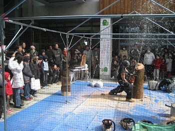 平成20年2月17日(日)、桑名市長島町の「長島ふれあい学習館」(開館2周年イベント「モリゾー・キッコロと木で遊ぼう!」の会場)において、チェンソーアートの実演会を開催しました。