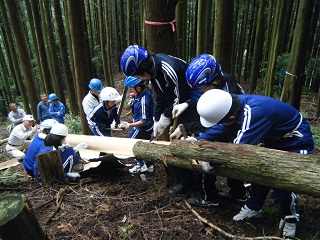 現地で森林や林業の話を聞いた後、2班に分かれて間伐木をみんなで力を合わせて倒し、その木の皮をむく作業や、ノコギリで枝を切る体験をしました。
